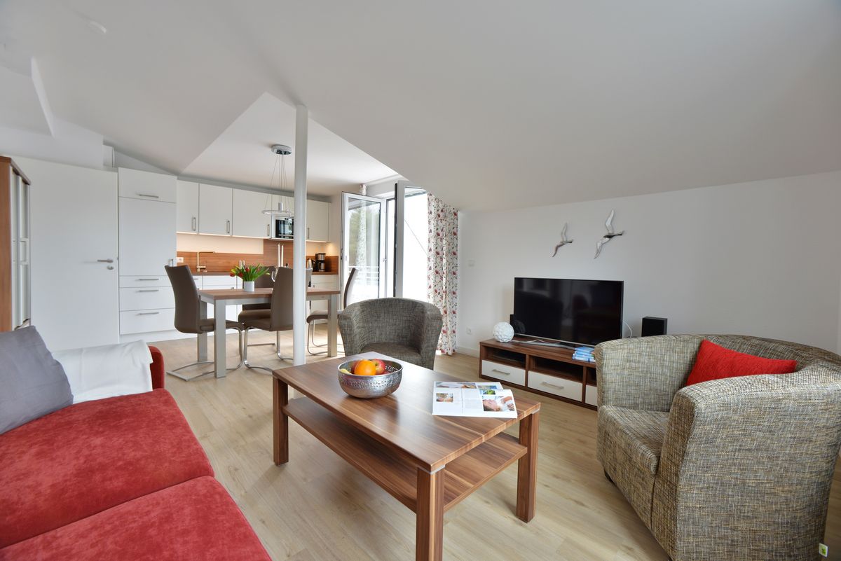 Die Ferienwohnung verfügt über ein Doppelbett im Schlafzimmer und eine große, bequeme Schlafcouch im Wohnbereich. Die modern und umfangreich ausgestattete Küche und der liebevoll eingerichtete Essbereich lassen keine Wünsche offen.