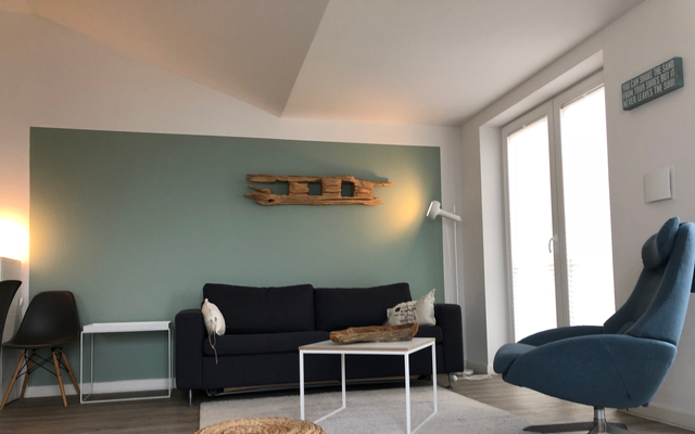 Die Wohnung ist hochwertig und ausgesprochen geschmackvoll und modern eingerichtet. In den Wohnbereich mit Couchecke, Sessel, Flatscreen-TV und Essbereich  ist eine Küche integriert. Auch von hier aus erfreut Sie der einmalige Blick auf das Meer. Das Schlafzimmer verfügt über ein Doppelbett und grenzt an den Südbalkon.