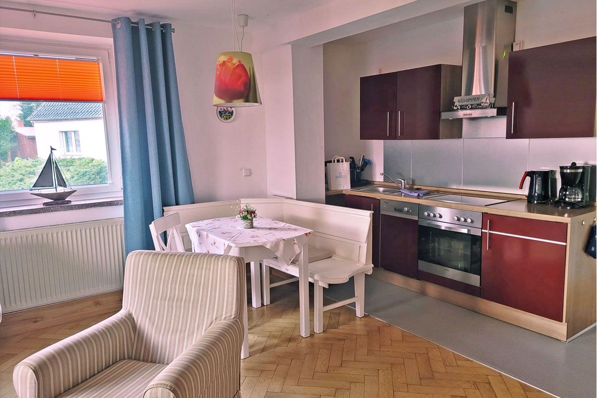 Die Ferienwohnung Hornfisch versprüht durch bei der Sanierung bewusst erhaltene Elemente wie den traditionellen Kachelofen und den Parkettboden einen ganz besonderen, authentischen Charme. Der gemütliche Wohnbereich vereint Wohnen und Kochen und verfügt über eine voll ausgestattete Küche. Das Schlafzimmer ist mit einem komfortablen Doppelbett ausgestattet und grenzt direkt an das moderne Badezimmer mit Dusche an.