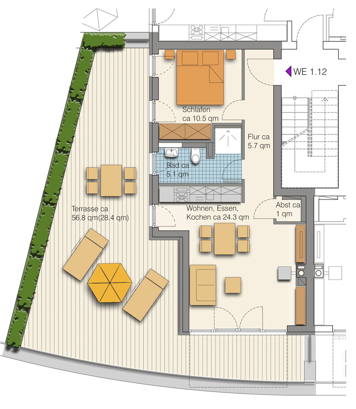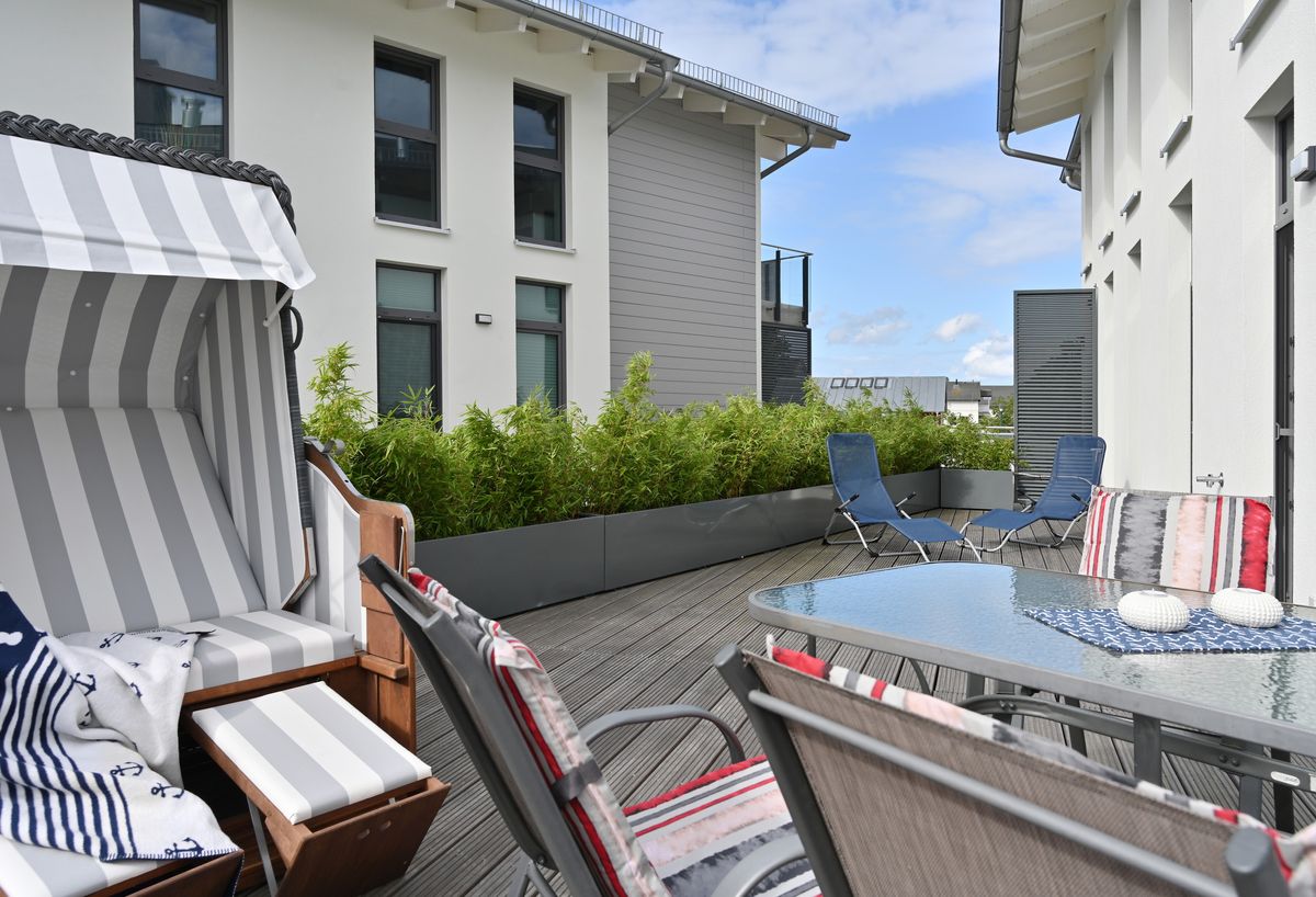• Balkon mit Terrasse mit Möbeln, Sonnenliegen, Sonnenschirm