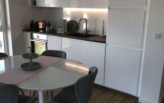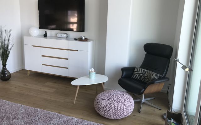 Die Ferienwohnung "schön gestrandet" befindet sich im 2018 errichteten "Bodden-Markt Glowe" im Ortszentrum des Erholungsortes. Die Wohnung bietet auf ca. 80qm Wohnfläche einen modernen, aber gemütlichen Wohnraum mit integrierter Küche, zwei Schlafräume, ein Bad mit Dusche und ein Gäste WC. Im Hauptschlafzimmer erleben Sie Ihre Träume in einem Boxspringbett mit durchgehender Matratze (180x200), das Kinderzimmer verfügt über ein Bett, welches auf eine Größe von 160x200 ausgezogen werden kann. Zwei große Balkone, auf denen sie wahlweise morgens oder abends die Sonne genießen, bieten zudem einen tollen Blick aufs Meer. Zur Wohnung gehört ein Tiefgaragenplatz und direkt im Haus steht eine große Gemeinschaftssauna mit Relaxbereich zur Verfügung.
