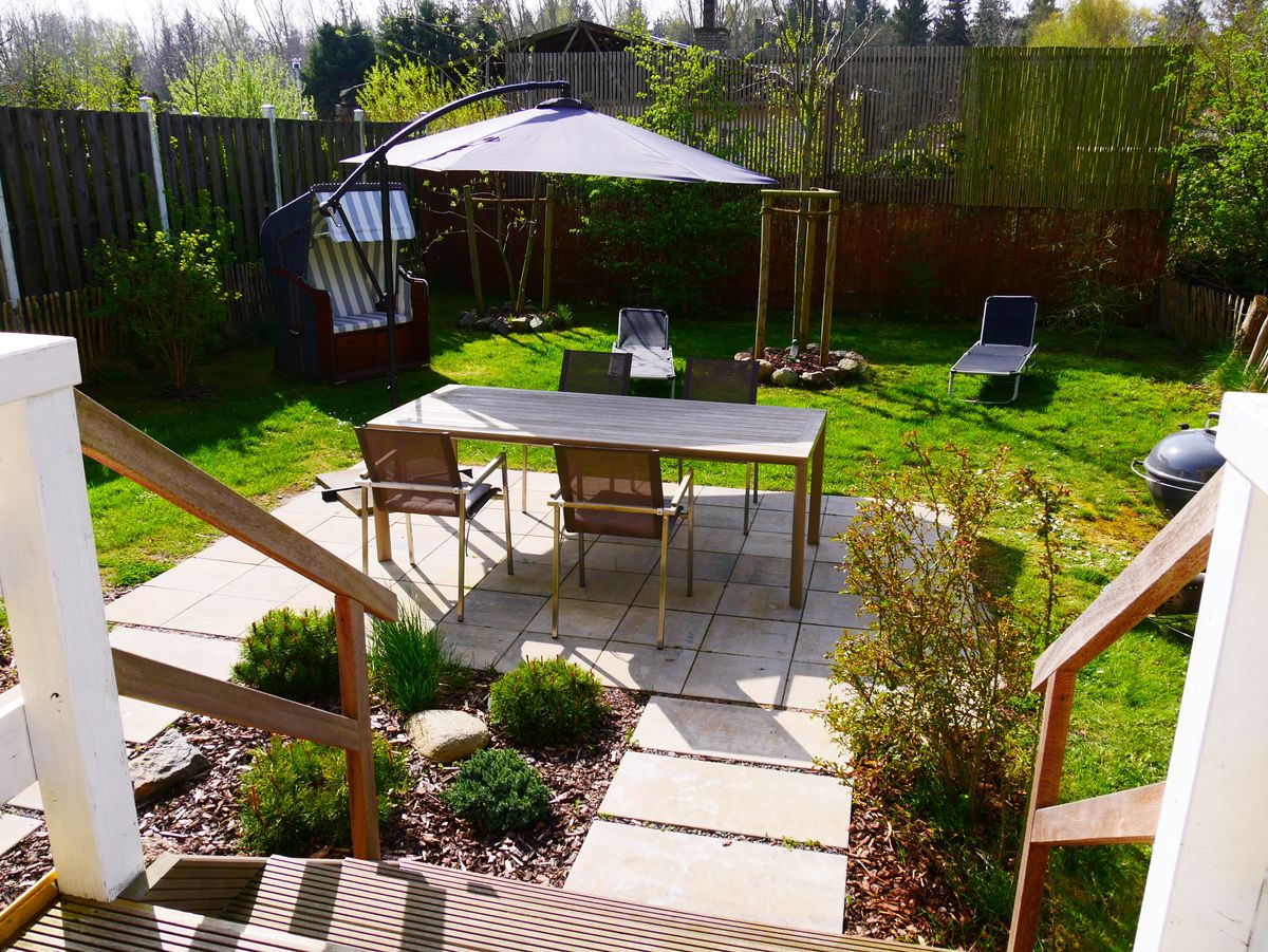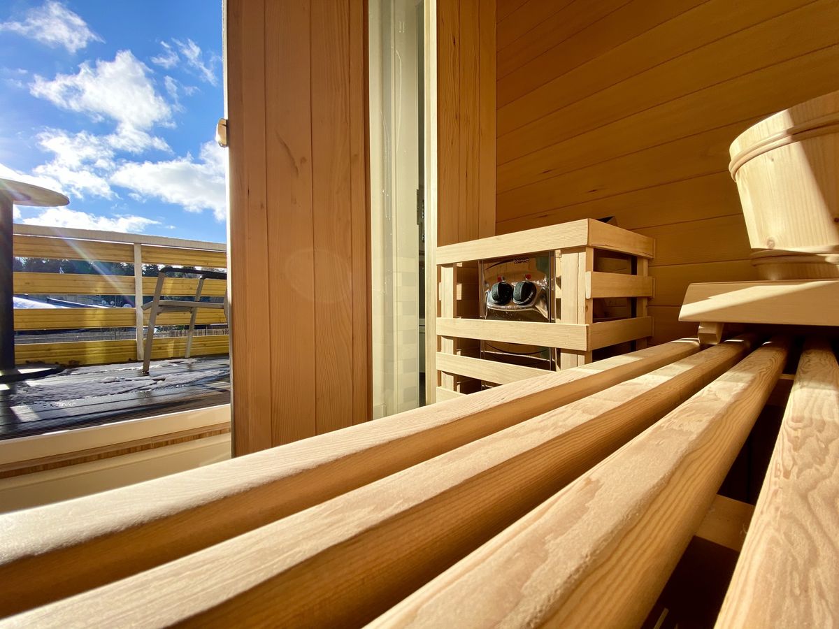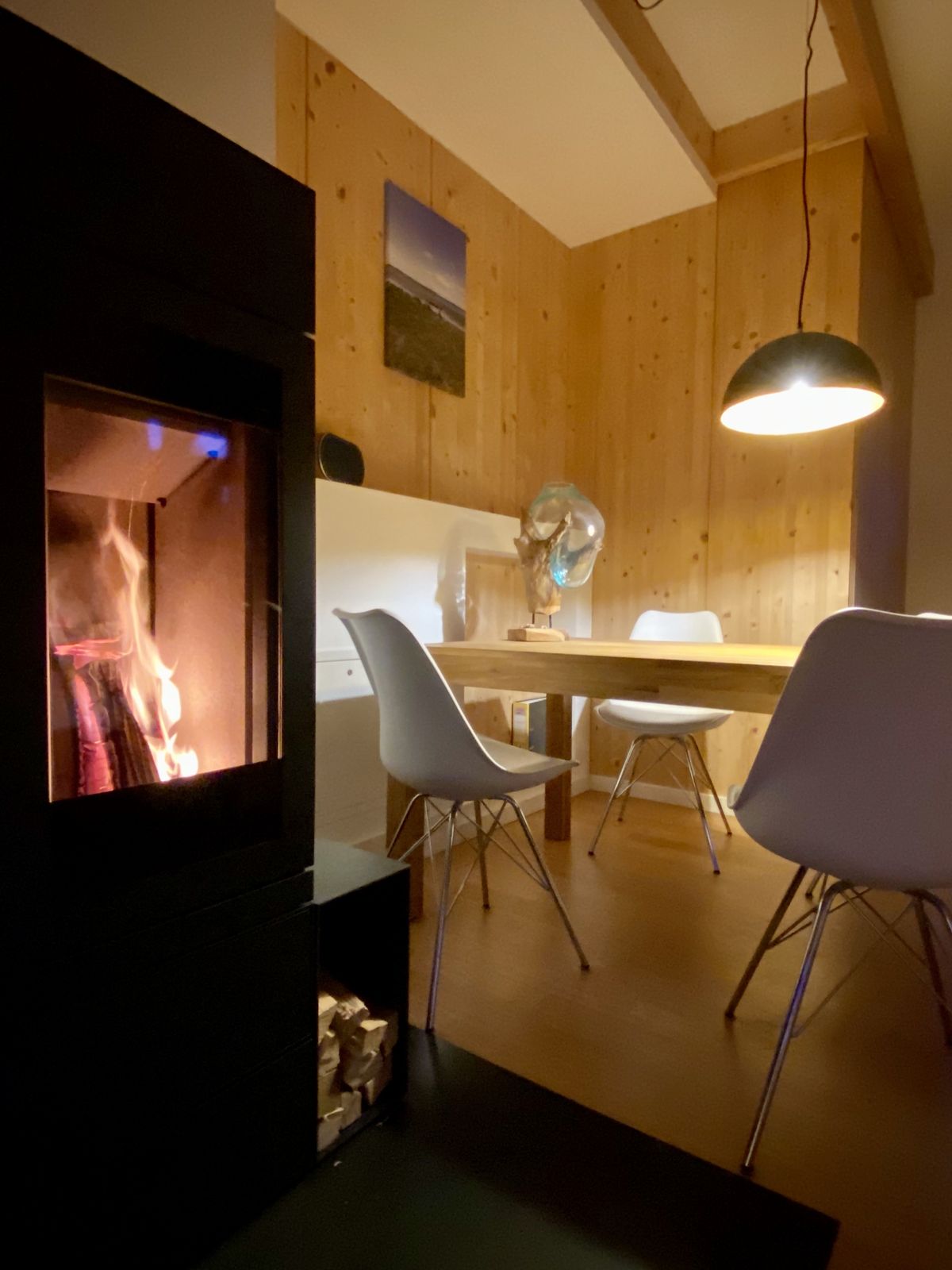 Das behagliche, offene Wohnzimmer mit bodentiefen Fenstern und direktem Zugang zum Garten, ein großer Smart-TV mit Blu-ray-Player, eine Bluetooth-Stereoanlage und der Essbereich mit Kaminofen und offener Küche sind Kommunikationsmittelpunkte des Hauses. Die Ausstattung der Küche bietet: eine Spülmaschine, Kaffeemaschine, Nespressomaschine, Milchaufschäumer, Mikrowelle, Wasserkocher, Toaster sowie umfangreiche Küchenutensilien. Im EG ist ein zusätzliches Bad mit Dusche, Waschmaschine und Trockner vorhanden. Zwei Schlafzimmer mit Doppelbett im Obergeschoss, jeweils mit Flachbild-TV und jeweils eigenem En-Suite-Bad und eine kleine Sauna, die von beiden Badezimmern aus zu betreten ist, bilden zusammen mit der Loggia ein weiteres Highlight.