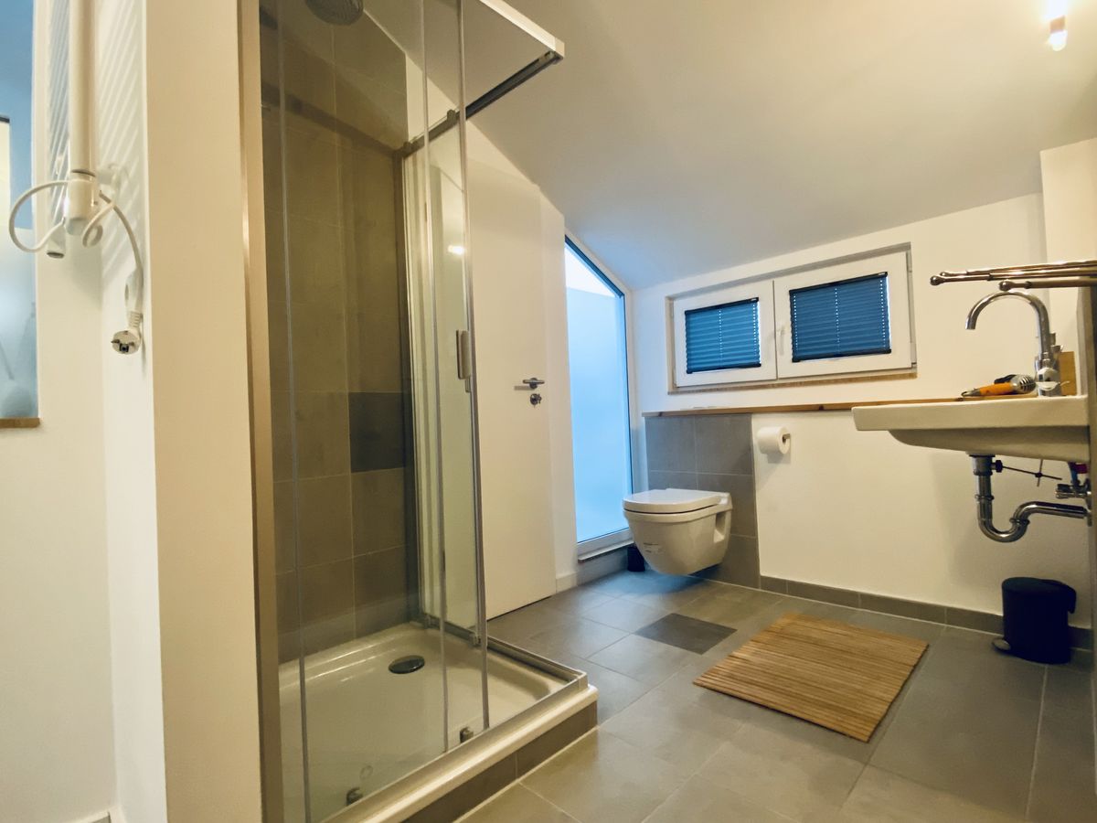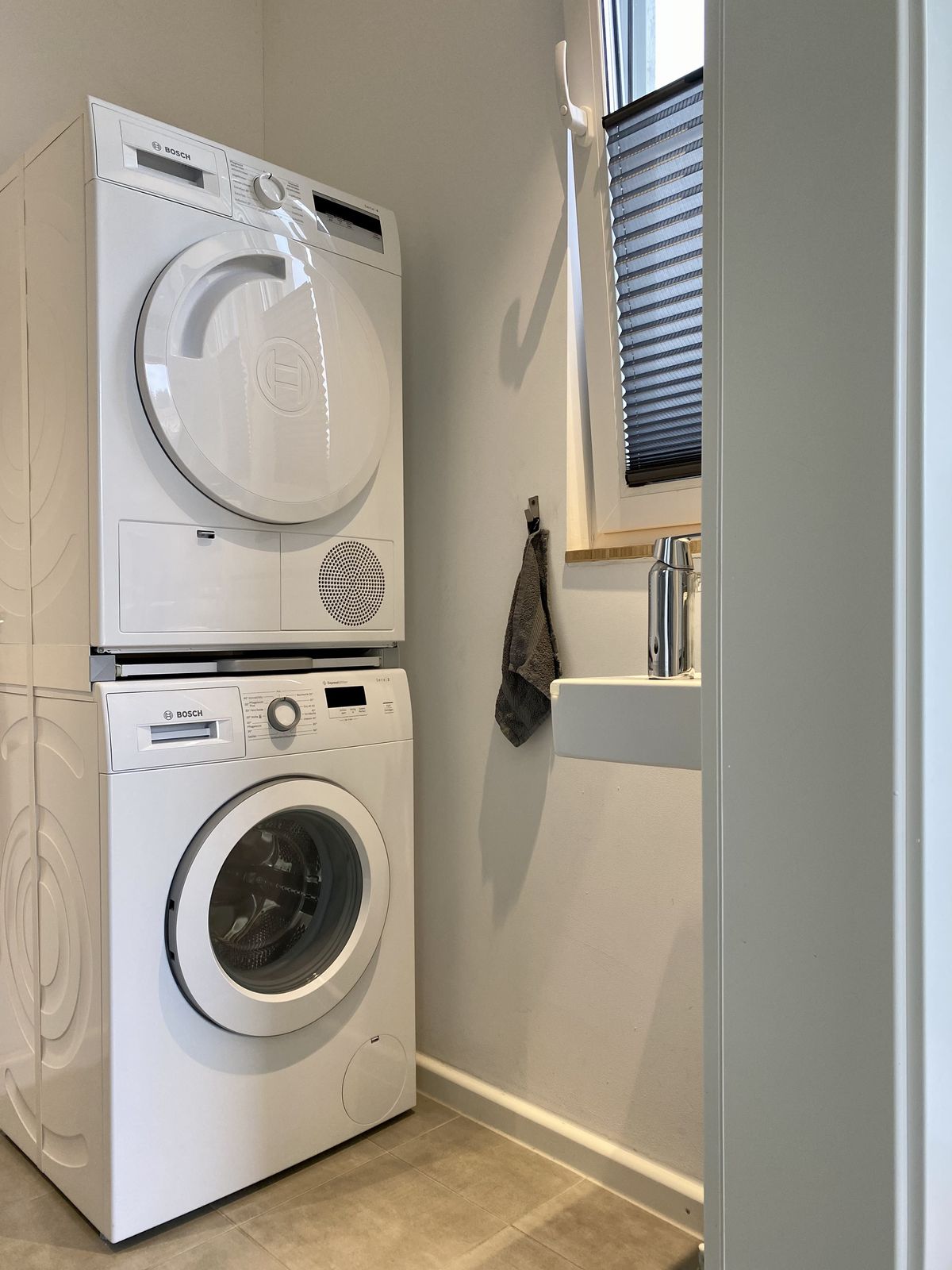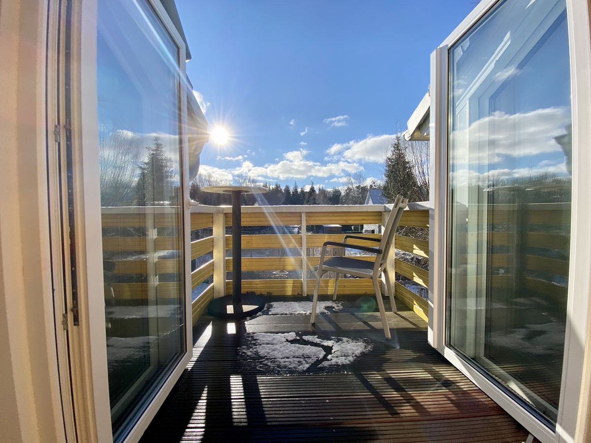 Das behagliche, offene Wohnzimmer mit bodentiefen Fenstern und direktem Zugang zum Garten, ein großer Smart-TV mit Blu-ray-Player, eine Bluetooth-Stereoanlage und der Essbereich mit Kaminofen und offener Küche sind Kommunikationsmittelpunkte des Hauses. Die Ausstattung der Küche bietet: eine Spülmaschine, Kaffeemaschine, Nespressomaschine, Milchaufschäumer, Mikrowelle, Wasserkocher, Toaster sowie umfangreiche Küchenutensilien. Im EG ist ein zusätzliches Bad mit Dusche, Waschmaschine und Trockner vorhanden. Zwei Schlafzimmer mit Doppelbett im Obergeschoss, jeweils mit Flachbild-TV und jeweils eigenem En-Suite-Bad und eine kleine Sauna, die von beiden Badezimmern aus zu betreten ist, bilden zusammen mit der Loggia ein weiteres Highlight.