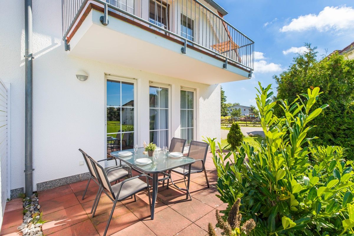• Terrasse mit Gartenmöbeln & Strandkorb