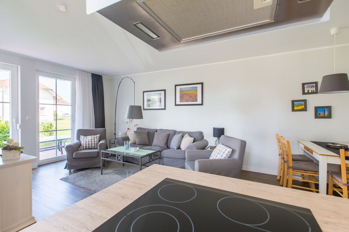 Die Fewo verfügt über zwei Schlafzimmer (1x Doppelbett 1,80 x 2,00m; 1x kl. Doppelbett 1,40 x 2,00m), ein Bad mit Dusche und ein Gäste-WC. Der Wohnbereich ist mit einer gemütlichen Couchecke und einem Essbereich in hellen Farben ausgestattet. Die Küche findet sich etwas abgetrennt, angrenzend an den Wohnbereich.