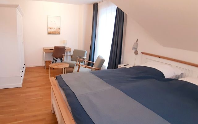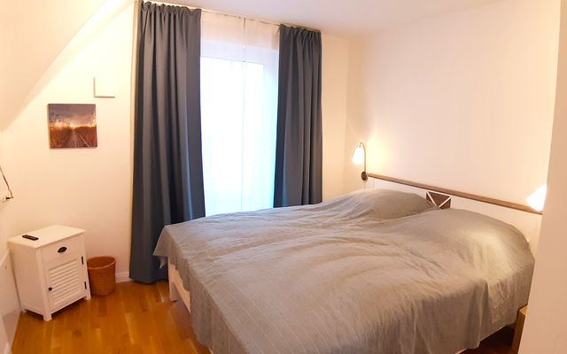 In 4 Schlafzimmern finden bis zu 8 Personen ein Plätzchen. 3 Bäder auf 3 Etagen garantieren, dass sowohl mehrere Paare als auch große Familien mit mehreren Generationen den gemeinsamen Urlaub und die Privatsphäre genießen können. Im barrierefreien EG befindet sich ein Schlafzimmer mit einem 140cm x 200cm großen Bett und angrenzendem Bad mit Dusche. Im 1. OG haben 2 Schlafzimmer mit jeweils einem Doppelbett (180 cm x 200 cm) Zugang zu einem großzügigen Wellnessbad mit Sauna und Dusche. Eines der Schlafzimmer hat einen direkten Zugang zu einer großzügigen Dachterrasse, von der man auf den Leuchtturm und den Bodden schauen kann- ideal für eine kurze Auszeit oder die Ruhephase zwischen den Saunagängen, welche man im Strandkorb dort genießen kann. Ein Schreibtisch sowie ein gemütlicher Ohrensessel im 1. OG bieten die Möglichkeit, sich zurückzuziehen - zum Arbeiten oder für eine Auszeit.