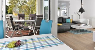 Der offene, lichtdurchflutete Wohnbereich mit integrierter, optimal ausgestatteter Küche lädt zum gemeinsamen Kochen oder Relaxen auf den Sofas oder vor dem Gaskamin ein. Am großen Esstisch, von dem man durch die bodentiefen Fenster in den Garten blickt, finden 8 Personen bequem Platz. Um den Urlaub auch für Eltern entspannt zu gestalten, sind die Treppen und Steckdosen gesichert, eine Kleinkindausstattung mit Kinderbett, Kindertritten, Hochstühlen, Kindergeschirr und - besteck ist bereits vorhanden. Diverse Spiele und Malutensilien sorgen für Abwechslung und ein Bollerwagen erleichtern die Aktivitäten am Strand und im Garten. Ein Terrassentisch für 8 Personen sowie Sonnenschutz und Strandkorb im Garten sind vorhanden. Für große oder befreundete Familien stehen die baugleichen Nachbarhäuser „Deich Frans", "Deich Frida und "Deich Michel" ebenfalls zur Verfügung. Es besteht die Möglichkeit, die Terrassentrennwände zu demontieren und so benachbarte Terrassen gemeinsam zu nutzen. Die Ostsee und der Strand sind in wenigen Minuten fußläufig zu erreichen.