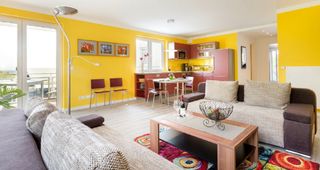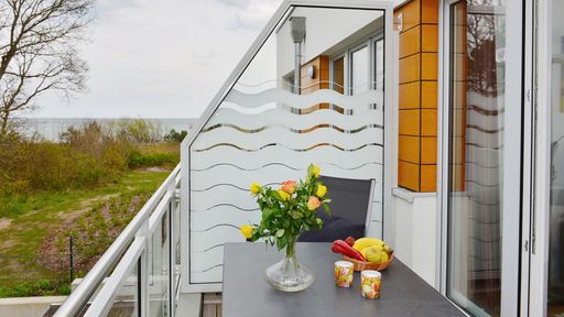 Die komfortabel eingerichtete und liebevoll dekorierte "Suite Meeresblick" befindet sich im Strandhaus Juliusruh, direkt hinter der Düne des Seebades Juliusruh. Hier können Sie die Nähe zum Meer mit entspannten Stunden auf dem Balkon oder Spaziergängen am Strand genießen. Die Ferienwohnung besitzt ein Schlafzimmer mit Doppelbett und eine Schlafcouch im Wohnbereich. In den Wohnbereich mit angrenzendem Balkon ist eine vollwertige Küche mit Esstisch integriert. Im Strandhaus Juliusruh stehen Ihnen eine Waschmaschine und Trockner sowie eine Sauna und für Ihre Drahtesel ein Fahrradkeller zur Verfügung. Sie nutzen kostenfrei einen Parkplatz am Gebäude.