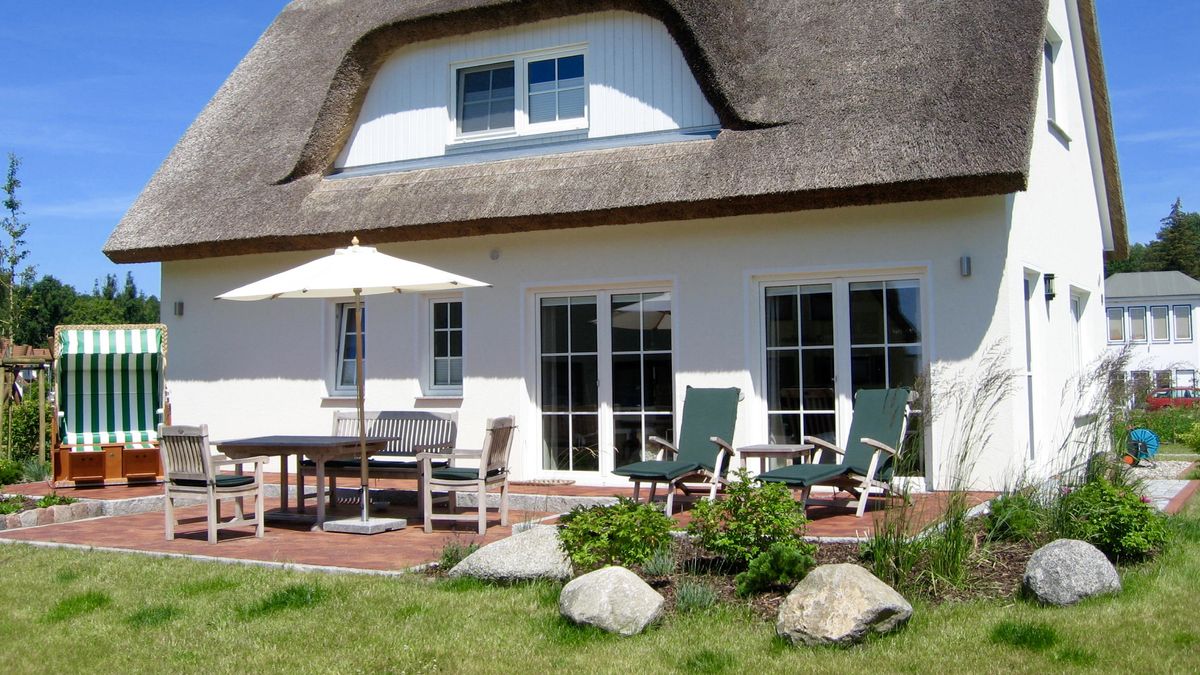 Zum Ferienhaus unter Reet gehört ein offener Garten mit Rasenfläche und dem herrlichem Blick auf den schönen Breeger Bodden. Die Terrasse ist mit einladenden Teakholzmöbeln, Deckchairs und zwei Strandkörben ausgestattet (von März bis Oktober). Hier können Sie die Seele baumeln lassen und die beruhigende und gleichzeitig belebende Wirkung der reizvollen Aussicht genießen.