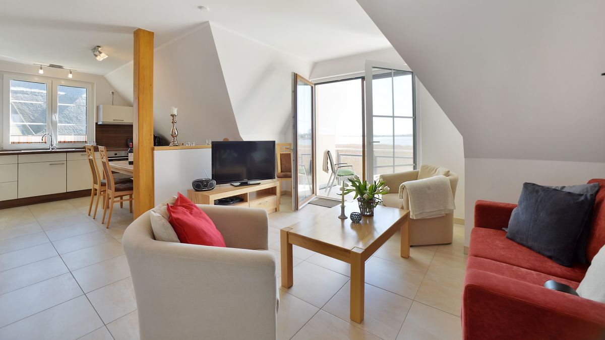 Die Ferienwohnung "Strandperle" ist eine exklusive Unterkunft im Strandhaus Juliusruh. Sie liegt direkt hinter der Düne des Ostseebades Breege/Juliusruh. Sie besitzt 2 Balkone. Durch die Lage im 2. Obergeschoss schauen Sie vom Ost-Balkon weit über den Sandstrand der Schaabe und die Ostsee. Der Südbalkon liegt geschützt. Dort lässt es sich auch bei etwas mehr Wind gemütlich in der Sonne relaxen. Die Wohnung ist hochwertig und ausgesprochen geschmackvoll und modern eingerichtet. In den Wohnbereich mit Couchecke, Sessel, Flatscreen-TV und Essbereich ist eine Küche integriert. Auch von hier aus erfreut Sie der einmalige Blick auf das Meer. Das Schlafzimmer verfügt über ein Doppelbett und grenzt an den Südbalkon.