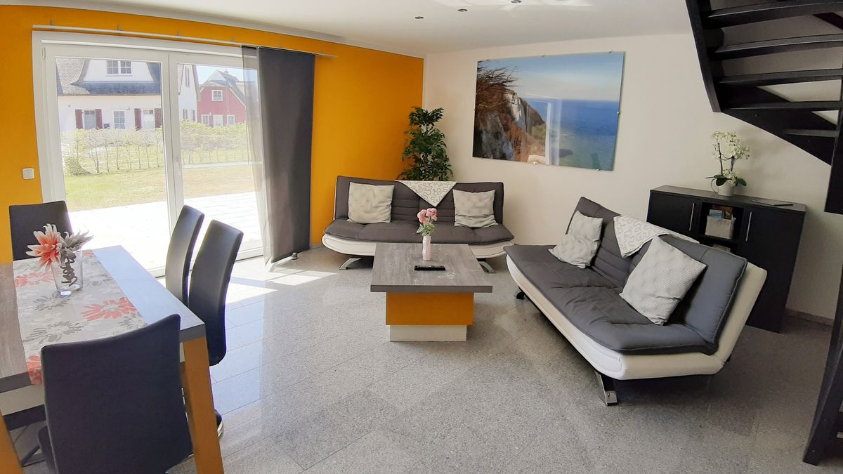 Unser Ferienhaus "Sternblick" ist nigelnagelneu und mit allem ausgestattet, was das Herz begehrt und erfreut durch viele funktionale und neckische Details. Das Feriendomizil mit kleinem Garten auf umzäuntem Grundstück befindet sich in zweiter Reihe direkt hinter dem Deich des Breeger Boddens, unweit des Ostseestrandes. In drei Schlafzimmern (2x 1 Doppelbett; 1x 2 Einzelbetten) finden bis zu 6 Personen ein Plätzchen. Der Wohnbereich mit angeschlossener Terrasse und integrierter Küche ist von gemütlichen Sitzmöbeln umgeben. Der große Esstisch lädt zu Geselligkeit mit der Familie und Freunden ein. Im EG befindet sich außerdem ein separater TV Raum. Außerdem ist der "Sternblick" durch schnelles Internet und einen hellen Arbeitsplatz Homeoffice tauglich. Die Sauna im OG (kostenpflichtig) eignet sich besonders an kalten Tagen zum Relaxen und Durchwärmen. Fahrräder können im Gartenhaus abgestellt werden. Die Ostsee und der Strand (Entfernung ca. 450m) sind in wenigen Minuten fussläufig zu erreichen.