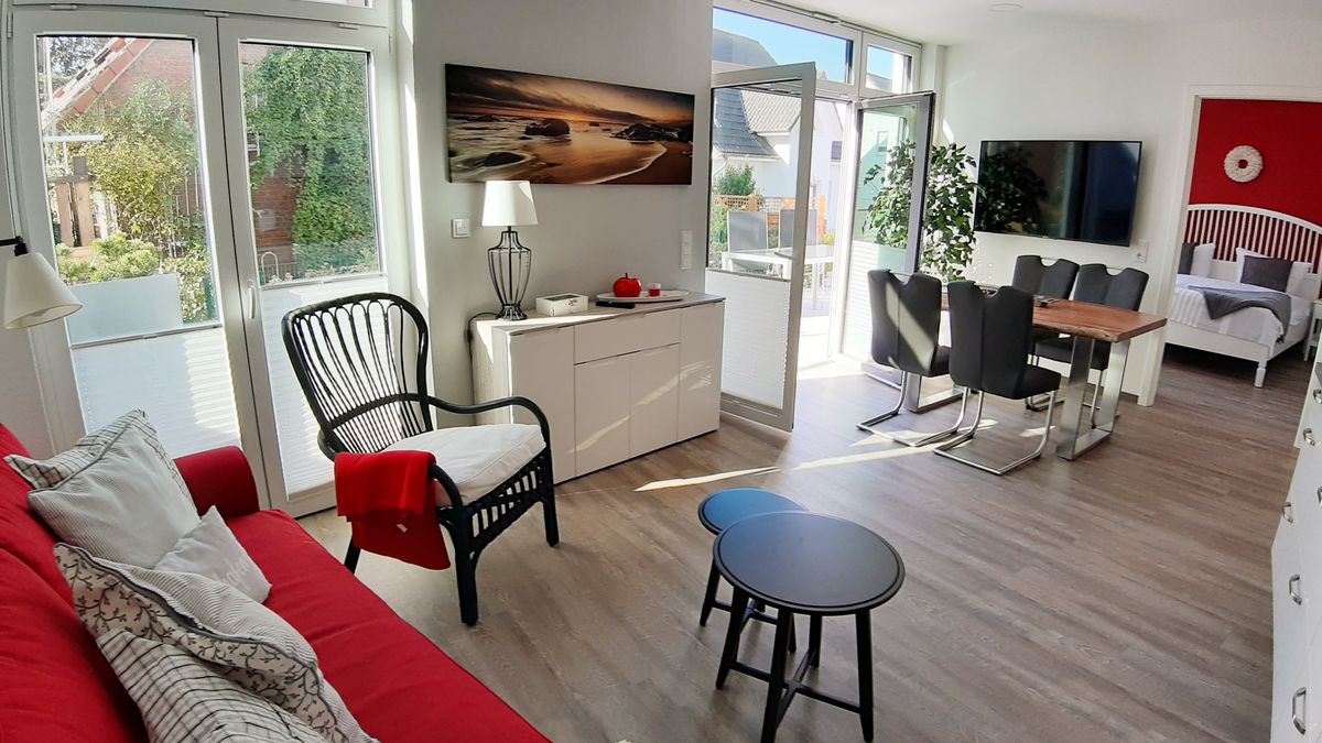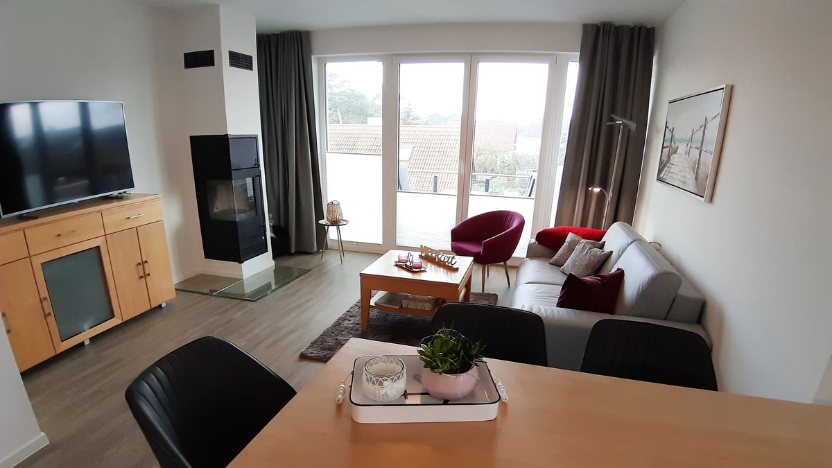 Die Nichtraucherwohnung verfügt über ein Schlafzimmer mit einem 1,80m breiten Boxspringbett mit durchgehender Matratze und freistehender Badewanne. Das Badezimmer beherbergt eine Dusche. Auf zwei Balkonen genießt man Sonne & Meer. Selbst bei schlechtem Wetter hat man in dieser lichtdurchfluteten Wohnung einen äußerst angenehmen Aufenthalt. Der Wohnbereich ist mit einem großen OLED-Flachbild-Fernseher und einer entsprechenden Heimkino-Musikanlage sowie einem Blu-ray/DVD-Player ausgestattet. Ein umfangreiches Angebot an Büchern sorgt für entspannte Momente. Selbstverständlich ist hier WLAN verfügbar.