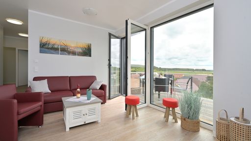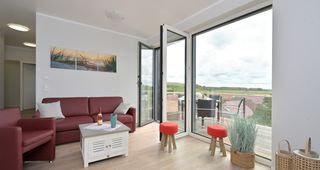 Die Ferienwohnung "BoddenPanorama" befindet sich im neuerbauten "Haus Seezeichen" im Ortszentrum des Erholungsortes Glowe. Auf 70qm Gesamtwohnfläche verteilen sich ein gemütlicher Wohnraum mit integrierter Küche, zwei Schlafzimmer mit jeweils einem Doppelbett sowie ein Bad mit bodengleicher Dusche. Auf dem 10qm großen Balkon mit Süd-West-Ausrichtung genießen Sie die frische Seeluft mit Ausblick auf die Tromper Wiek bis hin zum Kap Arkona. Zur Wohnung gehört außerdem ein Parkplatz in der hauseigenen Tiefgarage. Die Wohnung erreichen Sie auch bequem über einen Aufzug. Im angrenzenden Haus "Bodden-Markt" steht eine Gemeinschaftssauna mit Relaxbereich zur Verfügung, welche Sie nach Anmeldung kostenfrei nutzen und ein Waschsalon (kostenpflichtig).