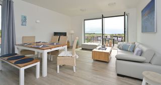 Die Strand nahe Ferienwohnung "ArkonaPanorama" im Haus Seezeichen in Glowe bietet drei geräumige Schlafzimmer mit insgesamt sieben Schlafplätzen, einen großzügigen Wohnbereich mit integrierter Küche und angrenzendem Balkon mit großartiger Aussicht bis zum Großen Jasmunder Bodden sowie zwei Bäder mit ebenerdigen Duschen. Die Wohnung erreichen Sie auch bequem mit einem Aufzug. Für Ihren PKW steht ein Tiefgaragenstellplatz, und im Nebengebäude stehen Ihnen ein Waschsalon und eine Gemeinschaftssauna zur Verfügung. Die Sauna nutzen Sie nach Anmeldung kostenfrei. Auf dem Gelände befindet sich außerdem ein kleiner Spielplatz.