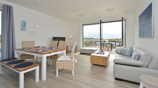 Die Ferienwohnung "Strandperle" ist eine exklusive Unterkunft im Strandhaus Juliusruh. Sie liegt direkt hinter der Düne des Ostseebades Breege/Juliusruh. Sie besitzt 2 Balkone. Durch die Lage im 2. Obergeschoss schauen Sie vom Ost-Balkon weit über den Sandstrand der Schaabe und die Ostsee. Der Südbalkon liegt geschützt. Dort lässt es sich auch bei etwas mehr Wind gemütlich in der Sonne relaxen. Die Wohnung ist hochwertig und ausgesprochen geschmackvoll und modern eingerichtet. In den Wohnbereich mit Couchecke, Sessel, Flatscreen-TV und Essbereich ist eine Küche integriert. Auch von hier aus erfreut Sie der einmalige Blick auf das Meer. Das Schlafzimmer verfügt über ein Doppelbett und grenzt an den Südbalkon.