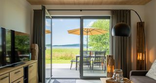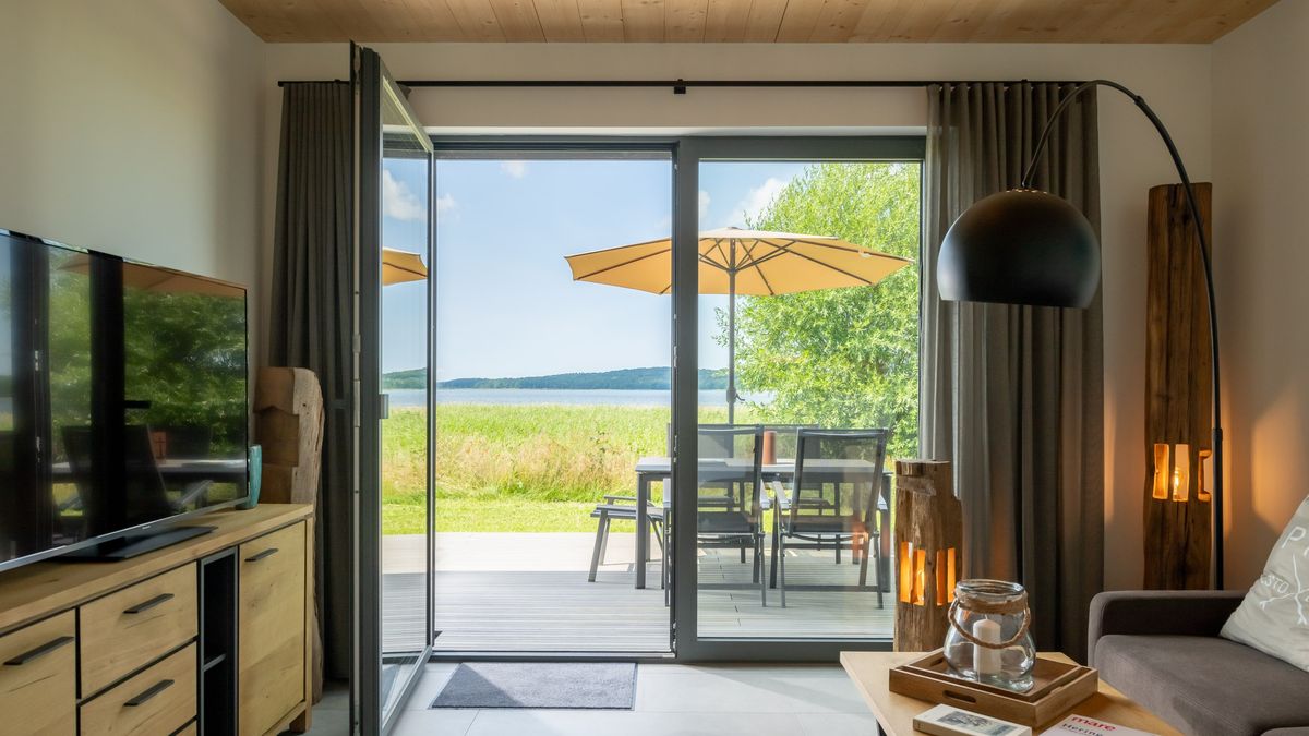 Unser Haus Lee am See bietet selbst auf der Insel Rügen eine sensationelle Lage auf einer kleinen Halbinsel am Südufer des Kleinen Jasmunder Bodden! Zwei Terrassen und ein grandioser Blick über die Boddenlandschaft versprechen ein naturnahes Erlebnis. Im Erdgeschoss des Hauses befinden sich der Wohnbereich mit Couchecke und TV sowie anschließender Terrasse, Essbereich und moderner Küche. Das Obergeschoss ist mit zwei Schlafzimmern mit jeweils einem Doppelbett und einem Bad mit Dusche ausgestattet. Die oberen Stockwerke werden über eine Echtholz Treppe erreicht. Im Spitzbogen findet sich ein Relaxbereich mit einer gemütlichen, breiten Schlafcouch und einem komfortablen Arbeitsplatz (WLAN mit Glasfaseranschluss vorhanden) mit Aussicht auf den Bodden. Das gesamte Haus ist mit Echtholz Parkett und Holzdecken ausgestattet. Das Ferienhaus am See bietet Platz für bis zu 6 Personen (Aufbettung mit zwei Babybetten möglich).