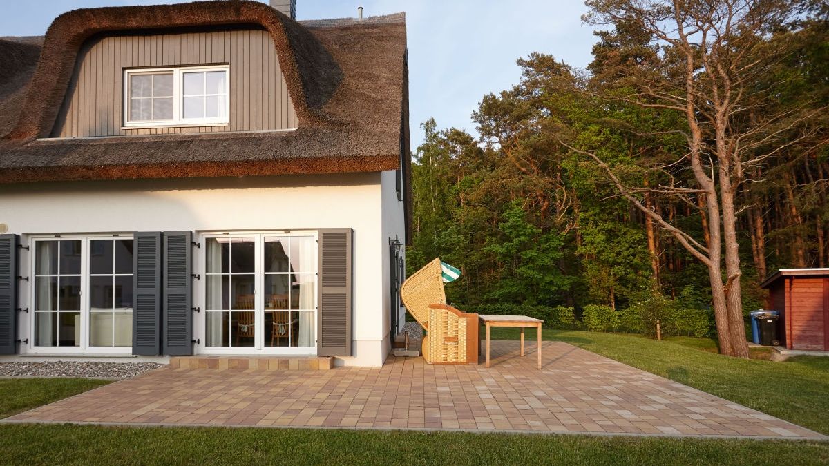 Die reetgedeckte Doppelhaushälfte "Wellenläufer" liegt in ruhiger Lage zwischen Breeger Bodden (80m) und der Ostsee (400m).