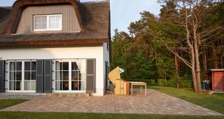 Im Spitzboden des 2. OG befindet sich eine gemütliche Dachkoje mit einem 140cm x 200cm Bett. Auch auf dieser Etage sorgt ein direkt angrenzendes Bad mit Dusche für Privatsphäre. Der offene, lichtdurchflutete Wohnbereich mit integrierter, optimal ausgestatteter Küche lädt zum gemeinsamen Kochen oder Relaxen auf den Sofas oder vor dem Gaskamin ein. Am großen Esstisch, von dem man durch die bodentiefen Fenster in den Garten blickt, finden 8 Personen bequem Platz. Um den Urlaub auch für Eltern entspannt zu gestalten, sind die Treppen und Steckdosen gesichert, eine Kleinkindausstattung mit Kinderbett, Kindertritten, Hochstuhl, Kindergeschirr und - besteck ist bereits vorhanden. Diverse Spiele und Malutensilien sorgen für Abwechslung und ein Bollerwagen erleichtert die Aktivitäten am Strand. Ein Terrassentisch für 8 Personen und eine elektrisch bedienbare Markise zum Sonnenschutz sind vorhanden. Die Markise bietet die Möglichkeit, eine gemütliche Beleuchtung dazu zu schalten. Für große oder befreundete Familien stehen die baugleichen Nachbarhäuser „Deich Frans", "Deich Alma“ und "Deich Michel" ebenfalls zur Verfügung. Es besteht die Möglichkeit, die Terrassentrennwände zu demontieren und so benachbarte Terrassen gemeinsam zu nutzen. Die Ostsee und der Strand sind in wenigen Minuten fußläufig zu erreichen.