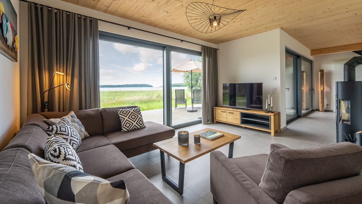 Unser Haus "Luv" am See bietet selbst für die Insel Rügen eine außergewöhnlich sensationelle Wasserlage auf einer kleinen Halbinsel am Südufer des Kleinen Jasmunder Bodden! Mehrere Terrassen und Loggien garantieren ein naturnahes Erlebnis. Das Herzstück des Hauses ist der große Wohnraum mit topp moderner Küche mit Kochinsel, großzügigem Essbereich, Kamin und etwas separat einer gemütlicher Couchecke mit TV. Außerdem befinden sich im Erdgeschoss ein Schlafzimmer, ausgestattet mit Doppelbett, TV und angeschlossenem Bad und ein Gäste-WC mit Waschmaschine und Trockner. Zwei weitere großzügige Schlafzimmer mit jeweils zwei Doppelbetten und TV befinden sich im ersten Obergeschoss. An diese grenzt ein Bad mit Walk-in-Dusche und Fenster. Die Galerie mit Ihrer Loggia eröffnet einen phantastischen, weiten Blick über die wunderbare Natur des angrenzenden Boddens bis nach Lietzow. Nachts ist sogar das Leuchtfeuer von Kap Arkona zu erkennen. Weiterhin steht hier ein Wellnessbad mit Sauna inkl. zusätzlichen Infrarotstrahlern zur Verfügung. Im Spitzboden sind zwei Einzelbetten und in einem weiteren Raum ein Arbeitsplatz (WLAN mit Glasfaseranschluss vorhanden) mit Aussicht auf den Bodden zu finden. Das Ferienhaus am See bietet Platz mit vollwertigen Betten für bis zu 8 Personen (weitere Aufbettung mit zwei Babybetten möglich).