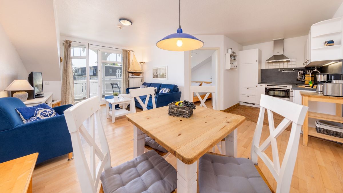 Unser "Möwennest" befindet sich im 2.OG der "Strandresidenz", unweit des Ostseestrandes von Juliusruh. Es besitzt ein Schlafzimmer mit einem großem Doppelbett, einen Wohnbereich mit Couchecke, Elektrokamin und TV, einen Essbereich und eine Küche mit allen Annehmlichkeiten. Ein Parkplatz direkt vor der Haustür steht kostenfrei zur Verfügung. Fahrräder können im Keller untergebraucht werden.