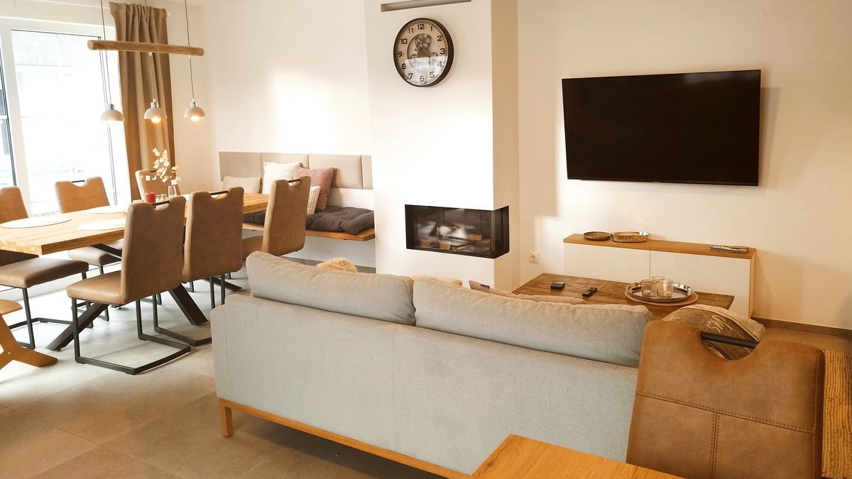 Der großzügige Wohnbereich mit angrenzender Terrasse lädt mit großer Sitzgruppe, Kamin und TV sowie komfortabler Küche zum Verweilen ein. Es sind zwei Bäder mit Dusche vorhanden.