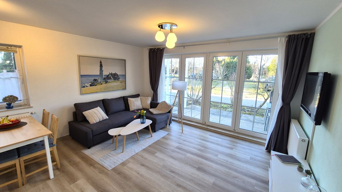 Die gemütliche 2-Zimmer-Wohnung "Meeresstrand" befindet sich in ruhiger Ortslage des Fischerdörfchens Breege. Der helle Wohnbereich mit bodentiefen Fenstern und Zugang zur Terrasse bietet eine Schlafcouch, einen großen Flachbildfernseher und eine kleine Auswahl an Büchern und Spielen für Tage mit launischem Ostsee-Wetter. Die offene Küche mit Esstisch grenzt direkt an den Wohnbereich, ist voll ausgestattet und lädt dazu ein, leckere Mahlzeiten zu zaubern – sofern Sie einmal nicht bei den guten Restaurants im Ort einkehren möchten. Im Schlafzimmer finden Sie ein 1,80 Meter breites Doppelbett (Boxspringbett mit durchgehender Matratze) sowie einen geräumigen Schrank vor. Die großzügige Terrasse mit umgebendem Garten ist mit Tisch und Stühlen ausgestattet und lädt dazu ein, die Abendsonne zu genießen und die einmalig frische Luft zu tanken. Das Bad mit Dusche bietet eine Waschmaschine mit Trockner. Ein fester Parkplatz ist im Angebot enthalten. Auch ohne Auto sind sie schnell am Strand (ca. 1 km) oder spazieren nach wenigen Schritten quer durch die Felder oder erkunden den duftenden Nadelwald. Hunde sind willkommen. Der Hundestrand befindet sich ebenfalls in Laufentfernung.